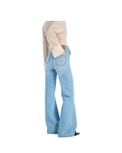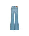 Flared Highwaisted Jeans Blue are crafted from organic cotton denim in a light blue wash. The design features a high-rise waist, flared legs, and classic five-pocket styling. Front flap details with metal buttons add a distinctive ROTATE touch. A leather logo patch is placed at the back waistband. Matches with Flared Denim Top Blue.
