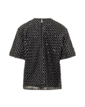 Beaded Oversized Top is designed with a relaxed, boxy silhouette and short sleeves. The surface is decorated with an all-over beaded grid pattern, adding texture and shine. The top features a round neckline, a straight hemline, and a back zip closure.
