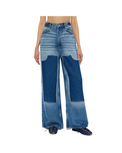 These Wide-Leg Jeans by Ganni exude avant-garde sophistication through their architectural silhouette and artful design. The high-waisted, bootcut fit is crafted from robust, classic denim, highlighted by contrasting dark rectangular panels—creating a distinctive color block effect. Expertly placed fading and shading soften the indigo, lending these jeans a modern, designer edge while maintaining a deliberately structured feel without any stretch.