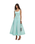 A zesty mint hue lends a delicious dose of colour to this midi dress. Gathering detail around the waist cinches in the form above its chic drop waist and full skirt – add heels for the next soirée.