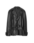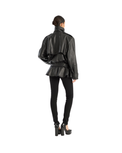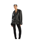 Biker Leather Jacket Black is crafted from smooth lamb leather and features a structured collar, front button closure, and a detachable belt. The hem is gathered in a peplum shape, adding volume to the silhouette. The jacket has lining.