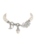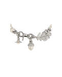 The Lucille Large necklace features a row of oversized Swarovski glass-based pearls, adorned with the house’s iconic acorn and leaf motifs. Enhanced with pave embellishments, the piece is finished with a swivel lobster clasp, from which a dangling orb elegantly hangs.