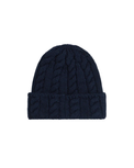 This navy blue wool beanie is knit into a chunky cable motif and finished with a Bally Crest label on the turn-up cuff.