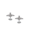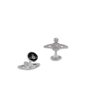 The Mini Bas Relief cufflinks offer a polished, silver-toned metal silhouette, adorned with glistening pave crystal details. The piece features an orb silhouette, which symbolises tradition, encircled by the celestial rings of Saturn, symbolising the future.