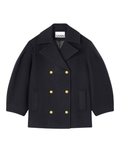 This oversized coat features a collar, button-front closure, 2 pockets and gold-tone buttons. It has a pleat at centre back and an inner pocket. Consider sizing two sizes down for a closer fit.