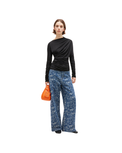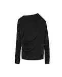 This top features an asymmetrical neckline, ruching at sleeves and a twisted open back detail.
